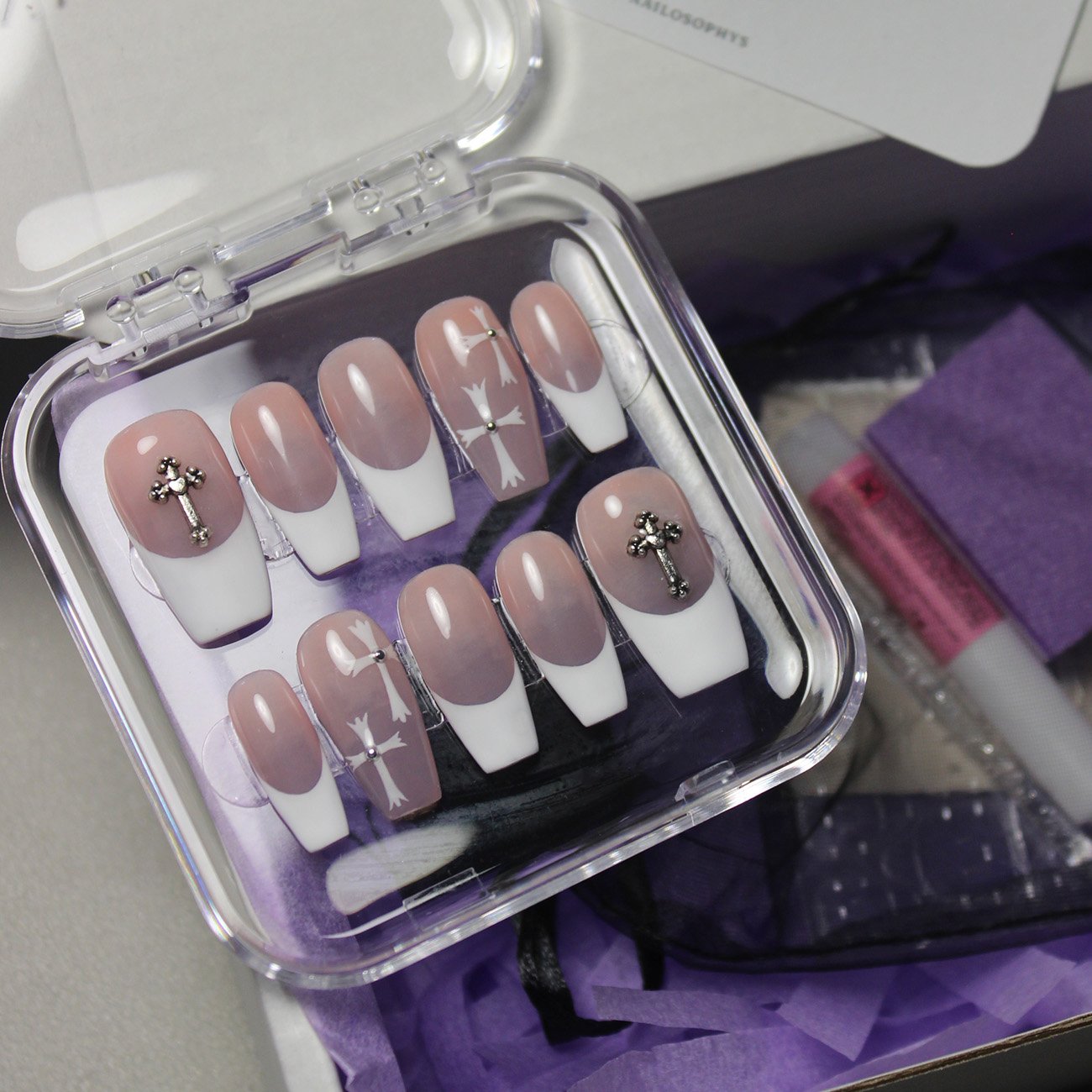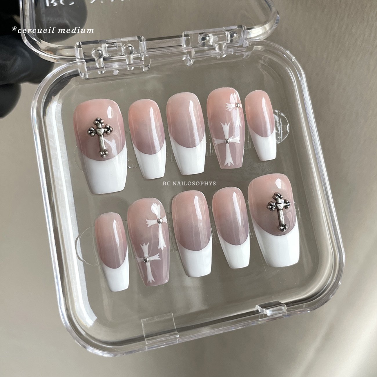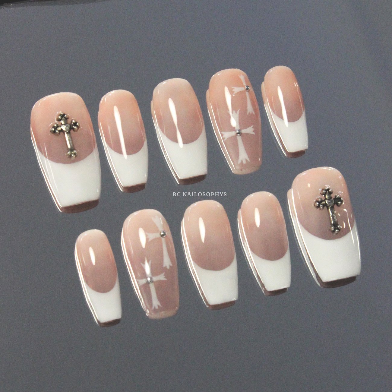 Ivory Devotion is a subtle expression of faith and elegance. A nude base melts seamlessly into crisp white French tips, creating a silhouette that feels timeless and quietly intentional. Cross charms accent the thumbs, while delicate cross-inspired chrome details grace the ring fingers, used not as symbols, but as shapes, lines, and symmetry. The contrast is gentle yet deliberate, where softness meets structure and minimalism is elevated through detail. A set that feels composed, refined, and effortlessly chic. ˚୨୧⋆.˚