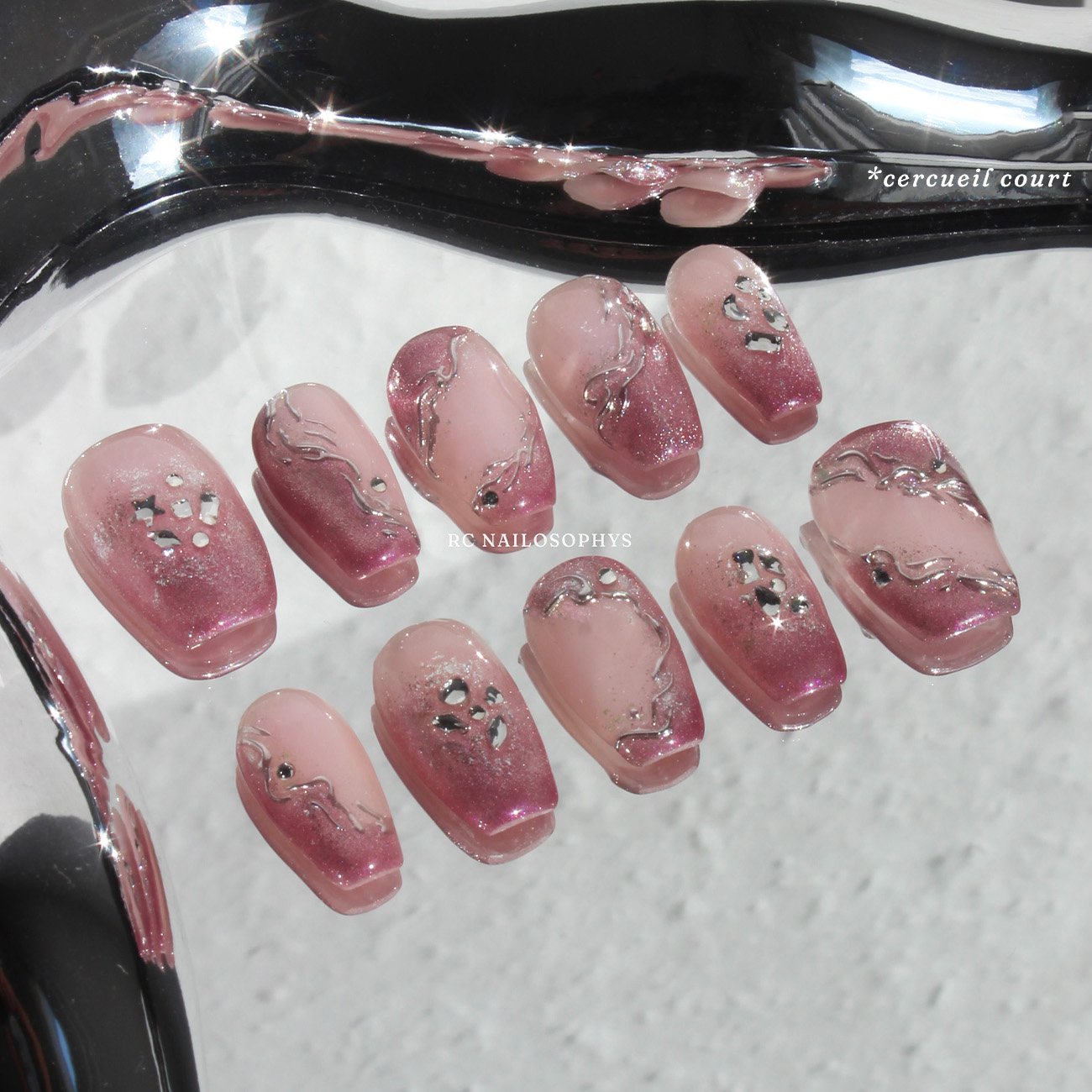 Comme le clair de lune capturé dans un battement de cœur, Pink Stardust scintille comme un ciel nocturne saupoudré de rose. Son éclat hypnotique en forme d’œil de chat est encadré de chrome argenté, avec des pierres précieuses qui dansent à chaque scintillement de lumière. Romantique, rayonnant et impossible à oublier, une lettre d’amour écrite dans les paillettes et les reflets. ˙⋆✮